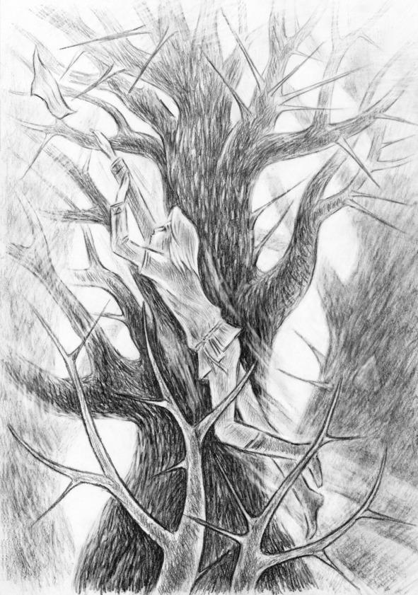 Получив сильный удар в грудь, юноша открыл глаза — острый шип упирался в его тело, но не более. Он по какой-то причине «пожалел» охотника и кроме сильного ушиба не причинил ему каких-либо повреждений, словно встретил вдруг непреодолимое препятствие на своём пути. Не имея времени объяснить происходящее, младший брат обхватил шип двумя руками и, прилагая все свои силы, освободился от его острого соприкосновения.