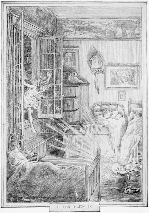 While she slept she had a dream. She dreamt that the Neverland had come too near and that a strange boy had broken through from it. He did not alarm her, for she thought she had seen him before in the faces of many women who have no children. Perhaps he is to be found in the faces of some mothers also. But in her dream he had rent the film that obscures the Neverland, and she saw Wendy and John and Michael peeping through the gap.