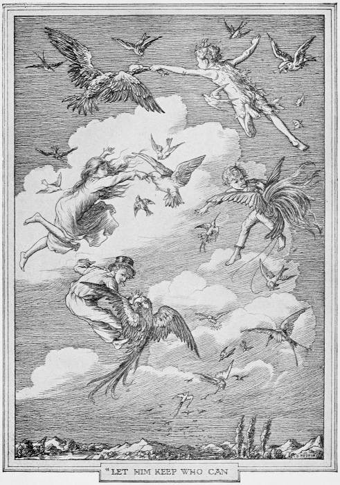 Tootles excitedly fitted the arrow to his bow. 'Out of the way, Tink,' he shouted; and then he fired, and Wendy fluttered to the ground with an arrow in her breast.
