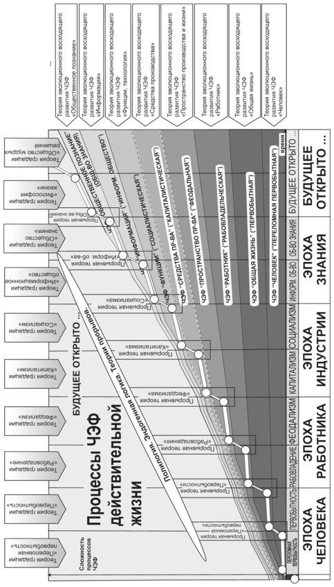 Так, например, забегая несколько вперёд, на схеме рисунка 25 было представлено восходящее движение каждой из «внеисторических, непреходящих базовых ценностей», как базовых типологических объектов, по историческим ступеням, можно сказать, «вещественно-продуктового мира человеческого бытия». Эти исторические ступени восхождения человеческого общества от переломной первобытности, через капитализм и социализм, до Общества мудрых решений и далее, — будущее открыто. Каждый шаг этого восхождения в реалиях действительной жизни неразрывно связан с переидеологизацией, с доминированием всё новых и новых «внеисторических, непреходящих базовых ценностей».