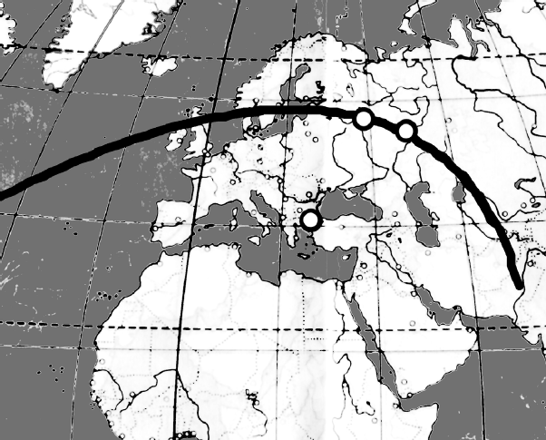 Рис. 1. Полоса полного солнечного затмения 1 мая 1185 года. Черными кружками на оси затмения отмечены города Владимир и Казань. Еще одним таким же кружком отмечен Ерос-Троя-Иерусалим на Босфоре.