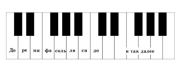 До (Do [доу]), ре (Re [рэ]), ми (Mi [ми]), фа (Fa [фа]), соль (Sol [сол]), ля (La [ля]), си (Ti [ти]), до (Do [доу]).