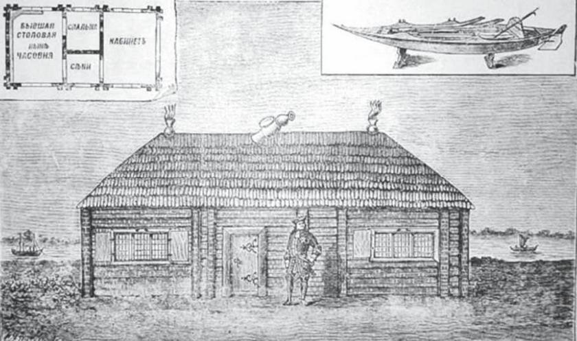 Первой завершённой постройкой нового города стали «Красные хоромы» – бревенчатый царский дом близ Троицкой площади. Желая, чтобы дом напоминал милую его сердцу Голландию, Пётр велел стесать бревна и расписать их имитацией красной кирпичной кладки, потому «хоромы» и прозвали Красными. Слово «хоромы» взято в кавычки не случайно – одноэтажный трехкомнатный домик, площадью в 65 квадратных метров, на хоромы определенно не тянет. Хороши хоромы – маленькая спаленка, кабинет да столовая! Но высочайший статус жильца и необычный вид здания не позволяли называть его «домом». Мало того, что крыша высокая и крыта черепицей (на самом деле то был гонт), так ещё и на ней установлена деревянная мортира, а на краях конька красуются пылающие бомбы. А как иначе? Жилец-то – не просто царь, а ещё и капитан бомбардирский. Окна тоже были необычными – огромные, во все стены!