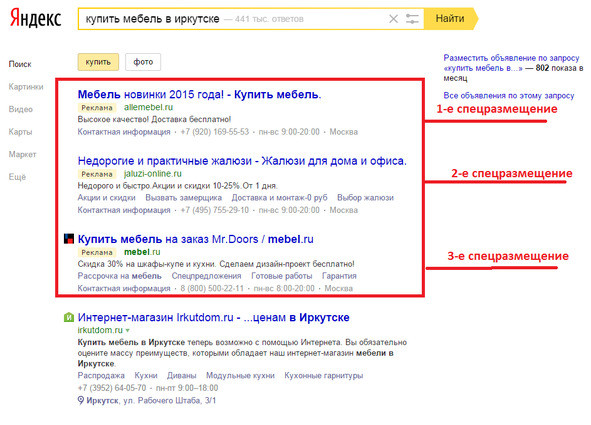 Спецразмещение — это 3 объявления над результатами поисковой выдачи: