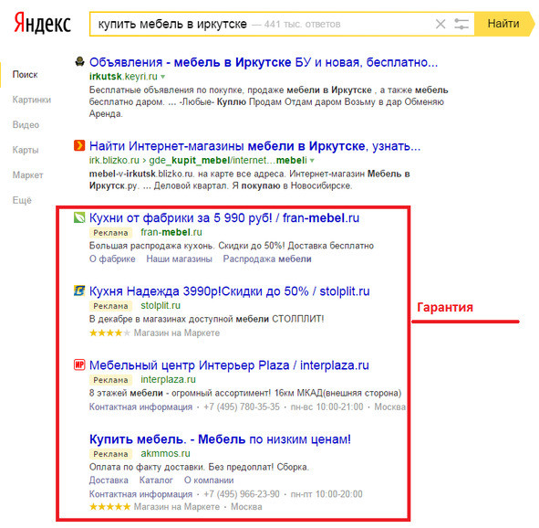 Гарантированнные показы — 4 объявления под результатами поиска: