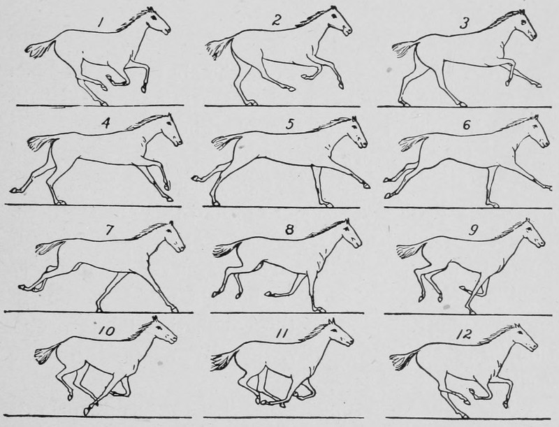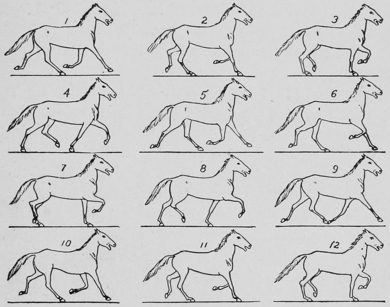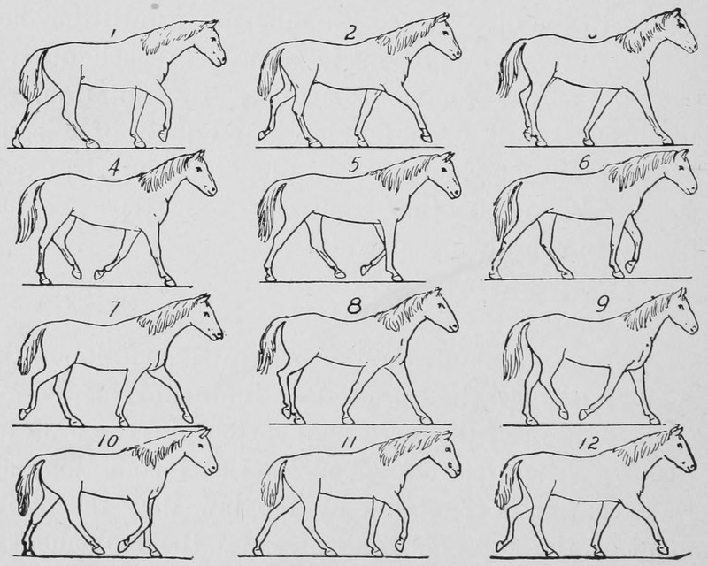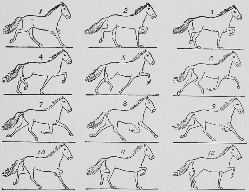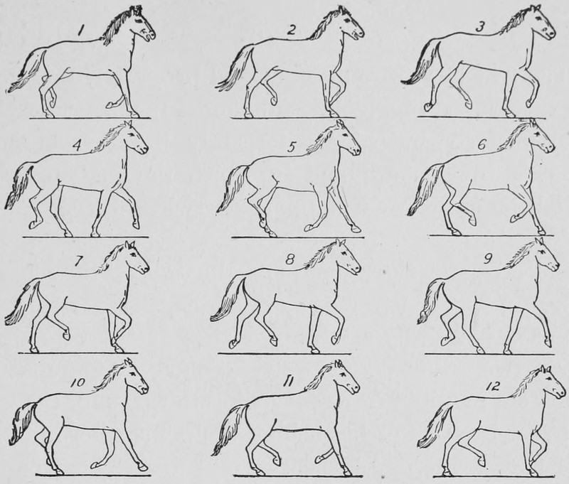 Several phases of as many different movements had been photographed, which the Author endeavored with little success to arrange in consecutive order for the construction of a complete stride.