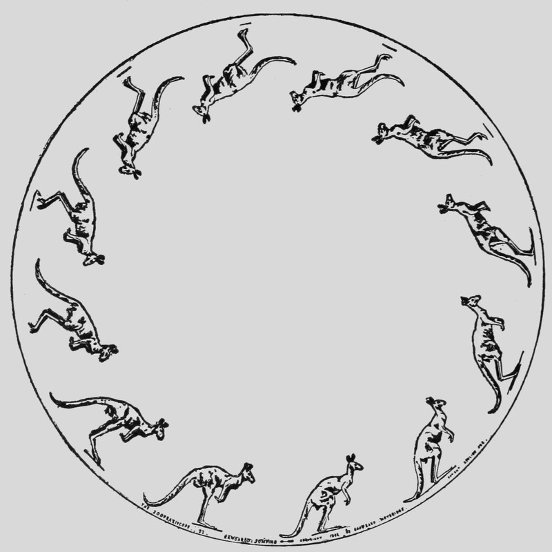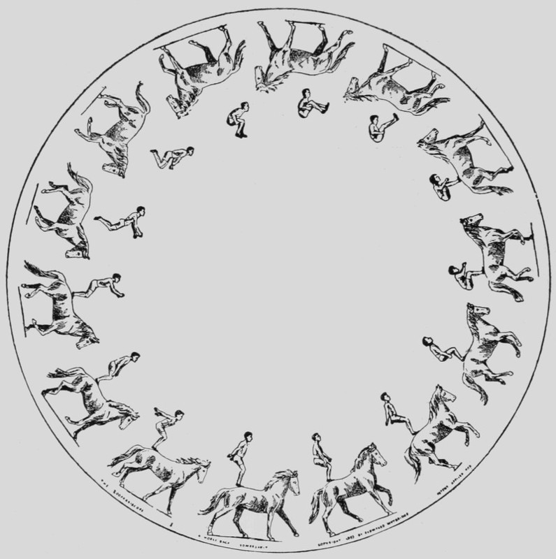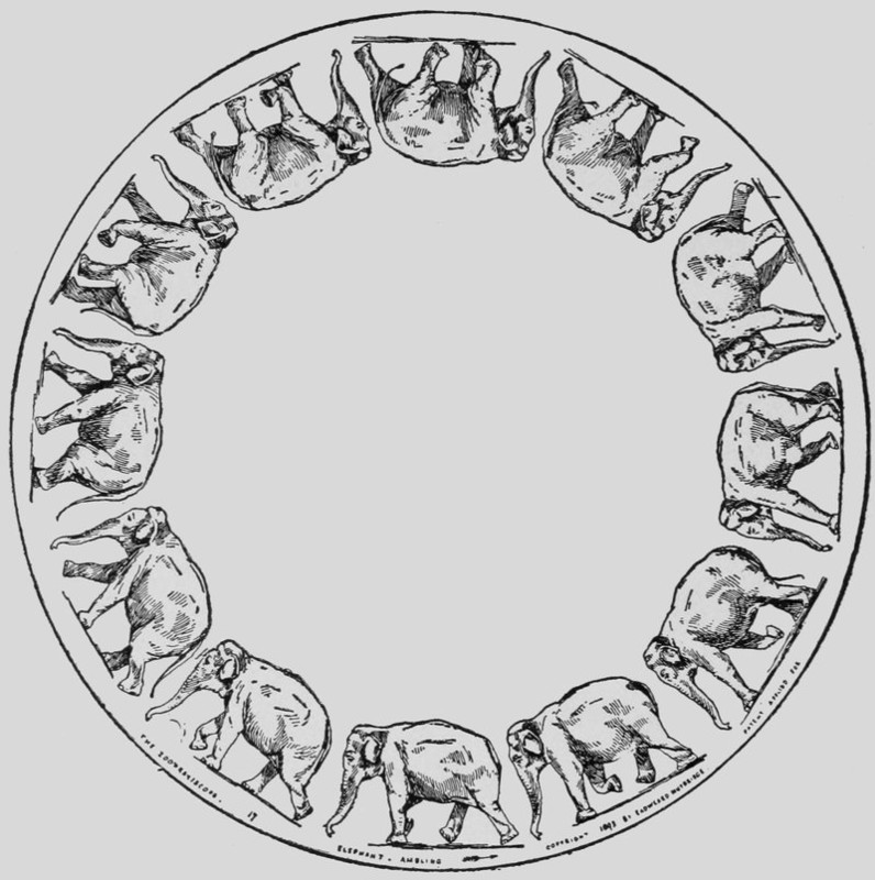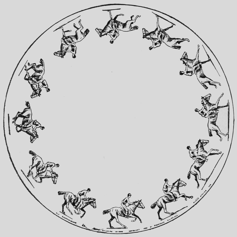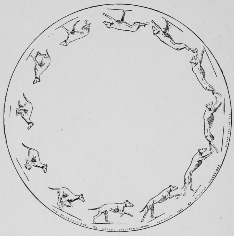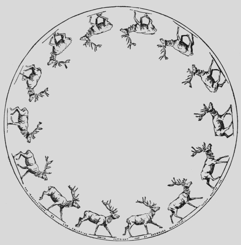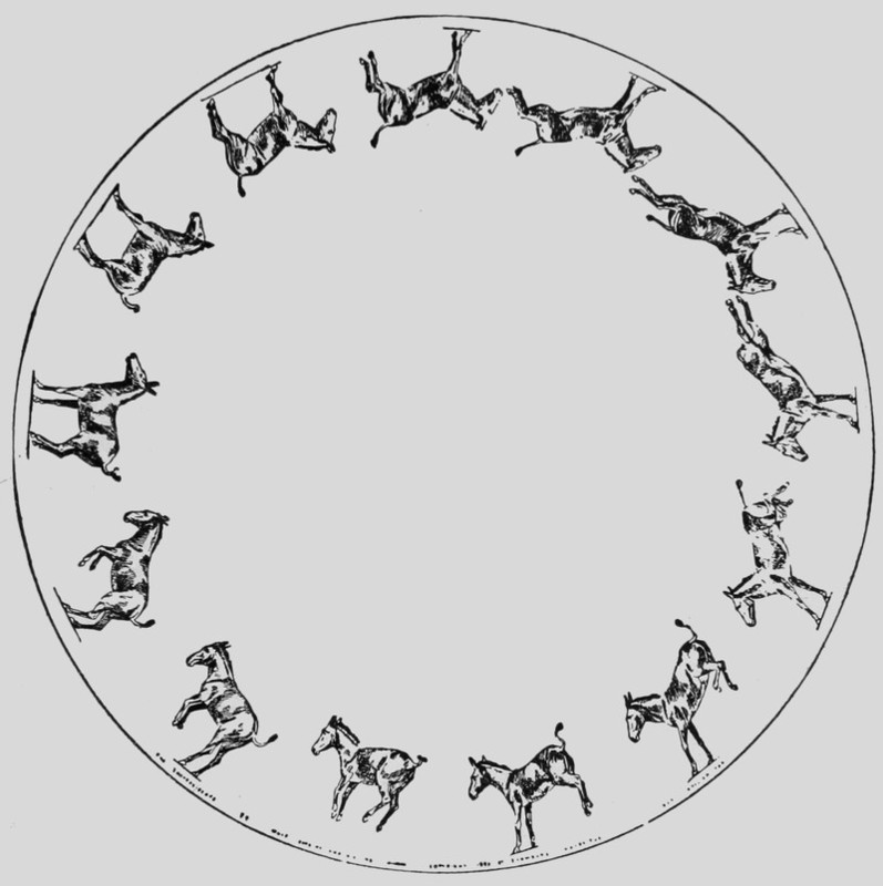 In the presentation of a Lecture on Zoöpraxography the course usually adopted is to project, much larger than the size of life upon a screen, a series of the most important phases of some act of animal motion—the stride of a horse, while galloping for example—which are analytically described. These successive phases are then combined in the Zoöpraxiscope, which is set in motion, and a reproduction of the original movements of life is distinctly visible to the audience.