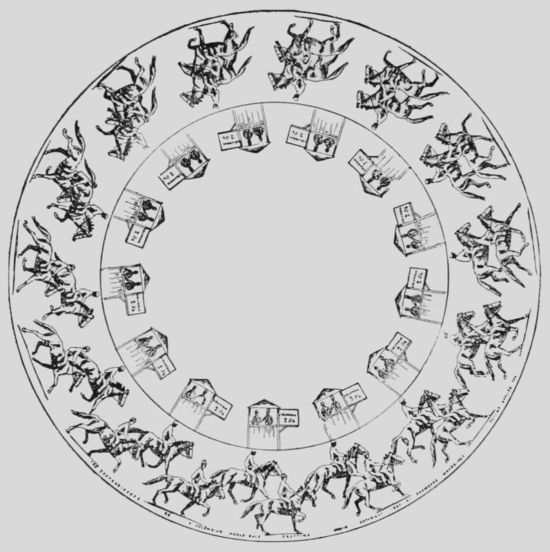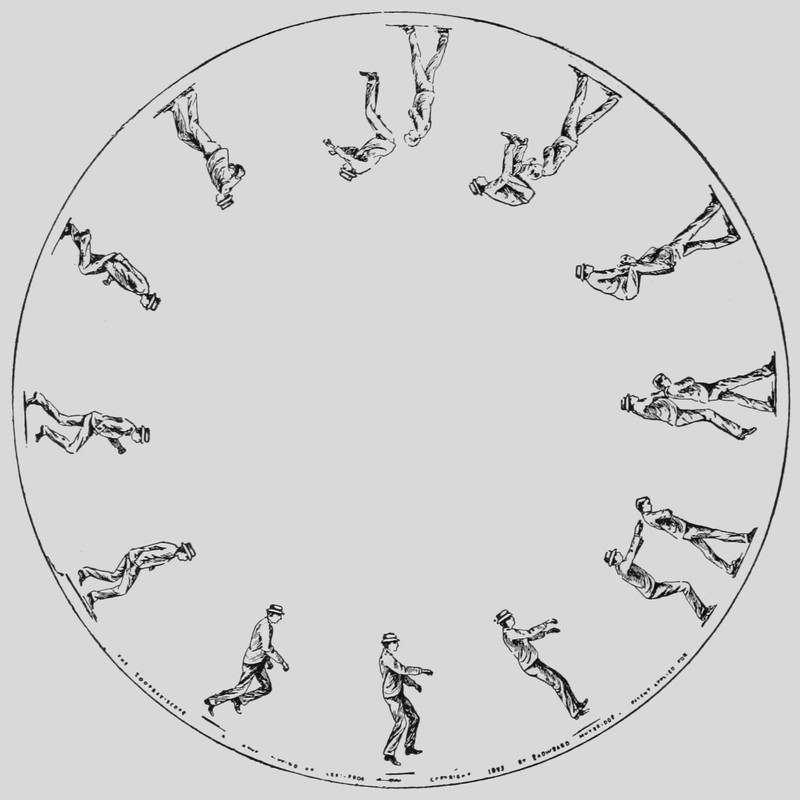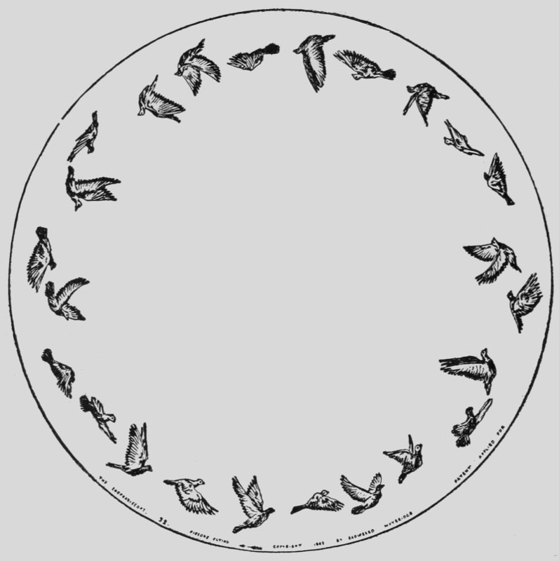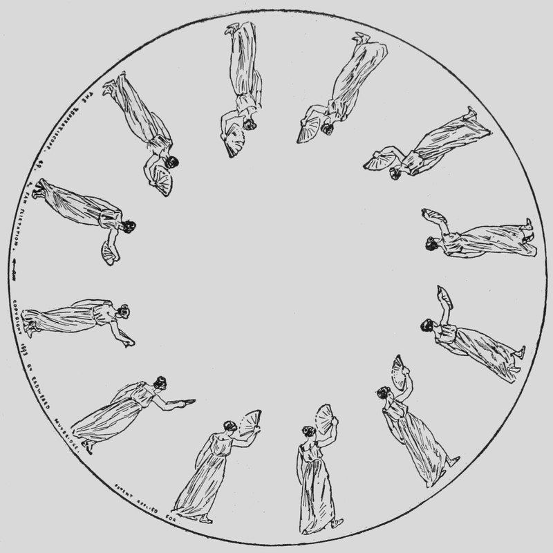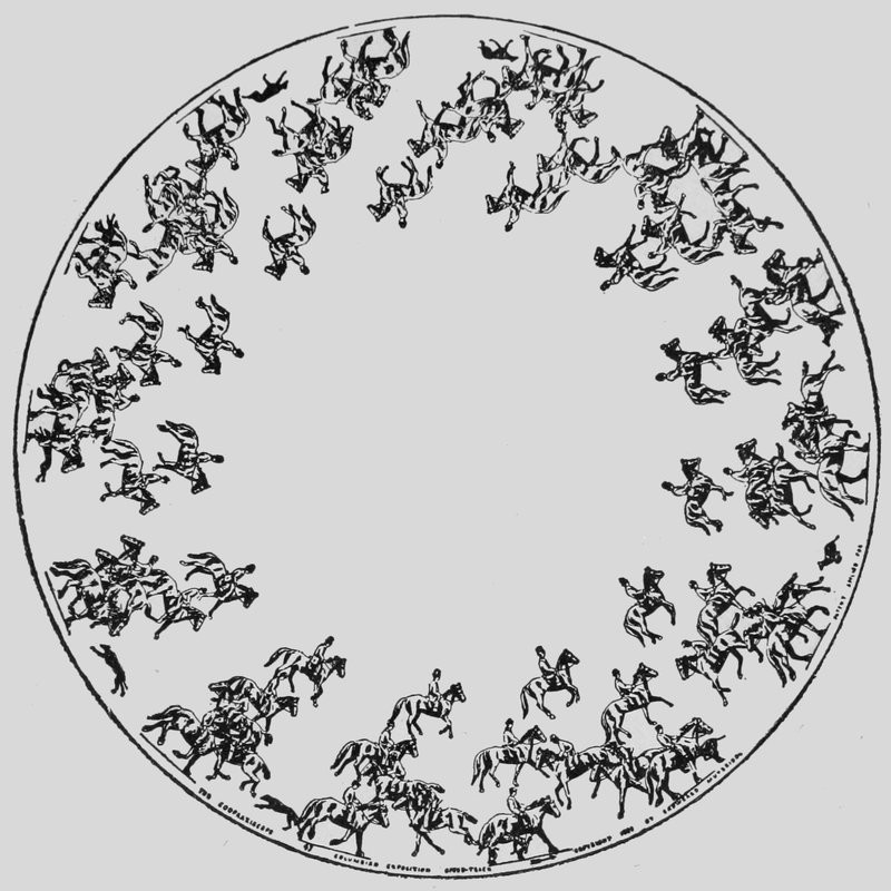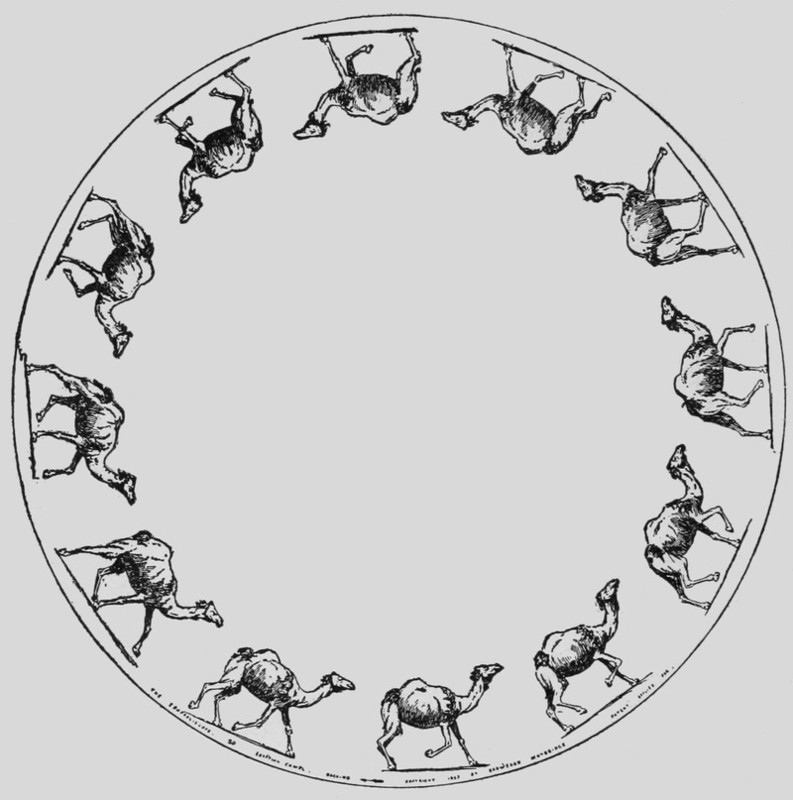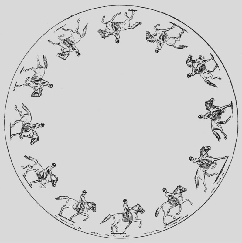 In the presentation of a Lecture on Zoöpraxography the course usually adopted is to project, much larger than the size of life upon a screen, a series of the most important phases of some act of animal motion—the stride of a horse, while galloping for example—which are analytically described. These successive phases are then combined in the Zoöpraxiscope, which is set in motion, and a reproduction of the original movements of life is distinctly visible to the audience.