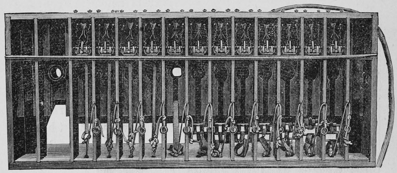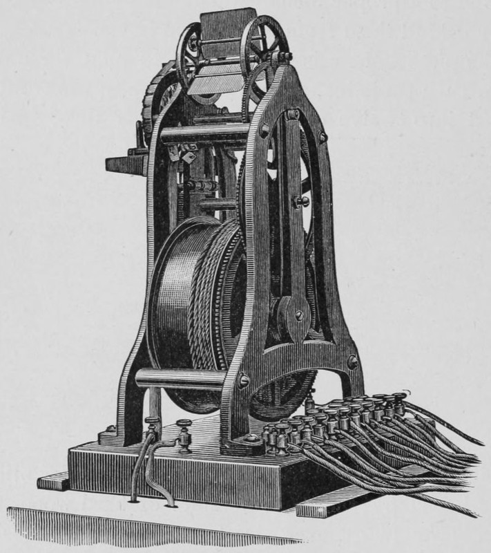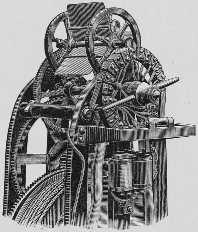 A shaft, connected by an arrangement of geared wheels to the drum, passes through the center of the segmented ring and carries a loose collar; a stout metal rod is firmly attached near its longitudinal center to this loose collar. One arm of the rod carries a laminated metal scraper, or contact brush, arranged to travel around the periphery of the ring, and in its revolution to make contact with each segment in succession. The contact brush is connected through the arm with one pole of the battery; and each segment—through its independent wire and magnet of the electro-exposors—with the other pole.