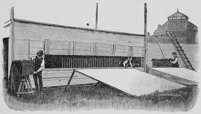 In the diagram, B is the Lateral background; consisting of a shed 37 metres or about 120 feet, long, the front of which is open, and divided by vertical and horizontal threads into spaces 5 centimetres, or about 2 inches, square, and by broader threads into larger spaces 50 centimetres, or about 19¾ inches, square.