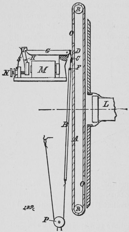 To the lower rod of the front aperture is fastened a ring C and a cleat, to which some elastic rubber bands B are attached; these bands are easily removable and their number increased at discretion; in some instances of rapid exposures a tension of twenty-five pounds or more was required. On a shelf of the frame is a magnet M, over the top of which is arranged a steel lever G pivoted near the end D which terminates with a slightly indented projection.