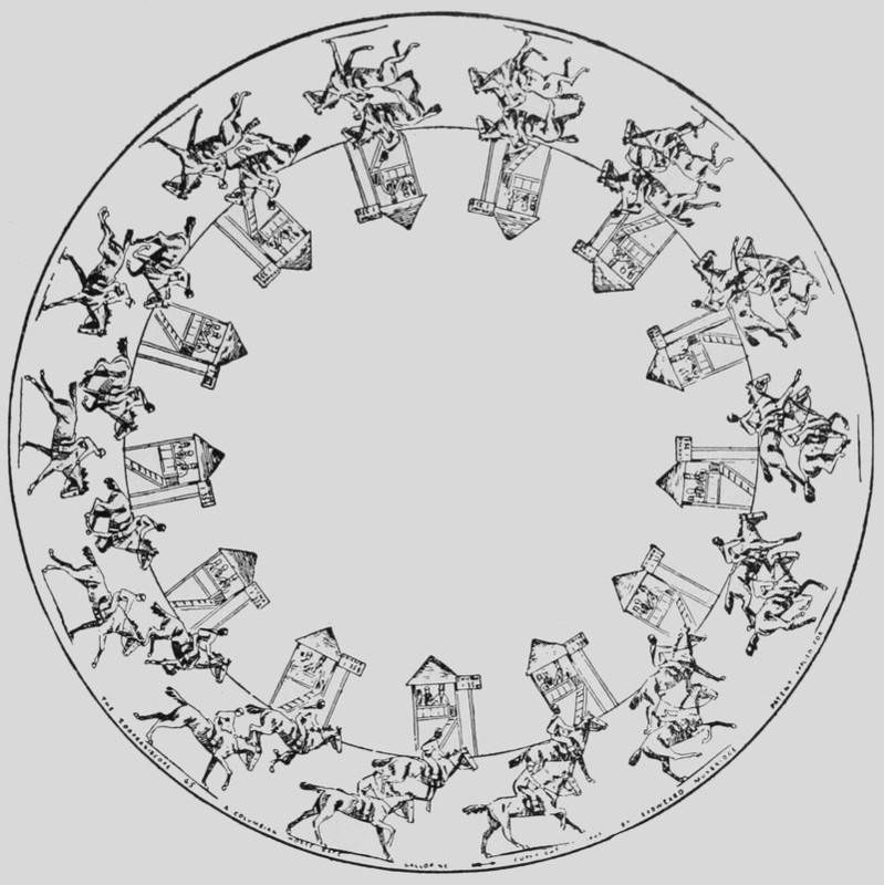 With this apparatus, horse-races are reproduced with such fidelity that the individual characteristics of the motion of every animal can readily be seen; flocks of birds fly across the screen with every movement of their wings clearly perceptible; two gladiators contend for victory with an energy which would cause the arena to resound with wild applause, athletes turn somersaults, and other actions by men, women and children, horses, dogs, cats and wild animals, such as running, dancing, jumping, trotting and kicking, are illustrated in the same manner. By this method of analysis and synthesis the eye is taught how to observe and to distinguish the differences between a true and a false impression of animal movements. The Zoöpraxiscopical exhibition is followed by illuminated copies of paintings and sculptures, demonstrating how the movement has been interpreted by the Artists of all ages; from the primitive engravers of the cave dwelling period, to the most eminent painters and sculptors of the present day.