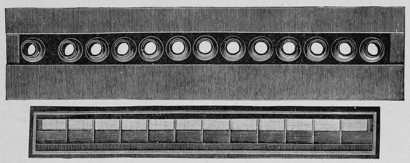The plate holder is constructed to hold three dry plates, each three inches by twelve inches; the front is divided into twelve compartments, each three inches square.
