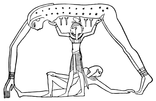 Рис. 1.1. Древнеегипетская богиня неба Нут, словно купол, накрывает собой Геба, бога земли, и Шу, бога воздуха и солнечного света. Ок. 2000 г. до н. э. (На основе материалов из нескольких источников, со ссылкой на: The Great Goddesses of Egypt, B. S. Lesko [Издательство Университета Оклахомы, 1999].)