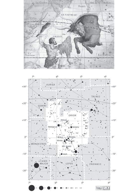Рис. 1.2. Сравнение образной звездной карты из Atlas Coelestis («Атласа звездного неба») Джона Флемстида 1776 года, на которой показаны созвездия Ориона и Тельца, и современной интерпретации той же области неба с очерченными границами созвездий. (Вверху: изображение любезно предоставлено Wikimedia Commons. Внизу: материалы любезно предоставлены constellationguide.com и Sky & Telescope.)