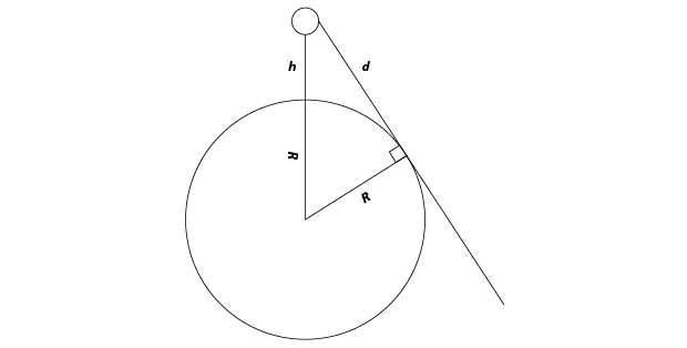 Рис. 2.1. Вид с поверхности Земли, как показано на этой схеме, зависит от высоты, на которой находится наблюдатель (h), и от радиуса Земли (R). Чем больше высота, тем дальше линия горизонта (d).