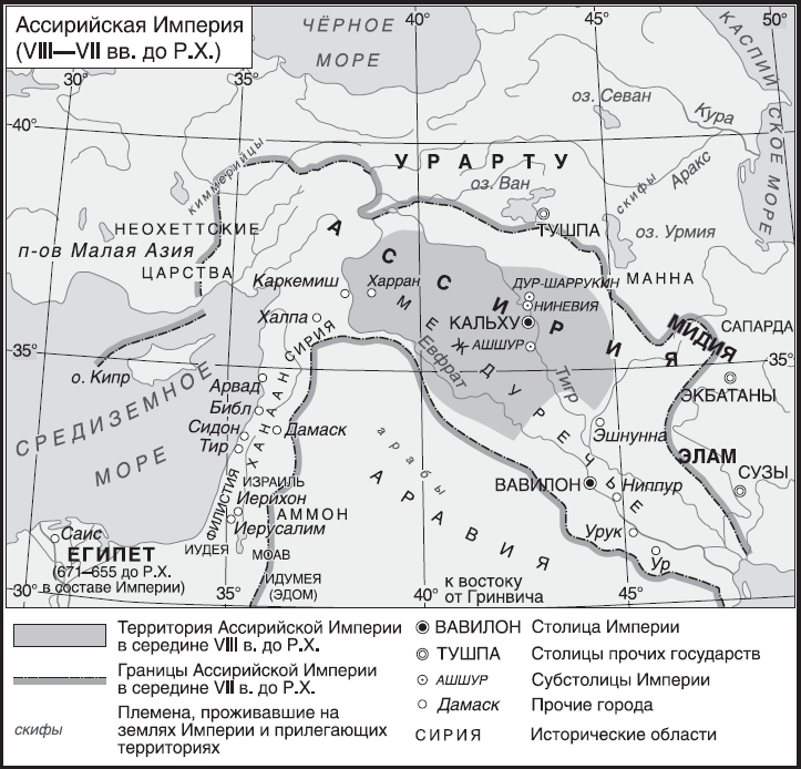 После святотатственного убийства Синаххериба его мятежными сыновьями над Ассирией начали сгущаться тучи: с севера Евразии появились грозные скифы – «народ сильный, народ древний, народ, которого языка ты не знаешь, и не будешь понимать, что он говорит. Колчан его – как открытый гроб; все они люди храбрые» (Иер 5:15–18). При их поддержке от Ассирии отложилась Мидия. Однако царь Ассархадон (681–669 гг. до Р.Х.) сумел обернуть возникший кризис в свою пользу. Он лично встретился с царем скифов и выдал за него замуж свою дочь, после чего, имея надежного союзника и крепкий тыл, завоевал Египет.