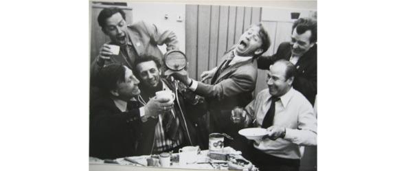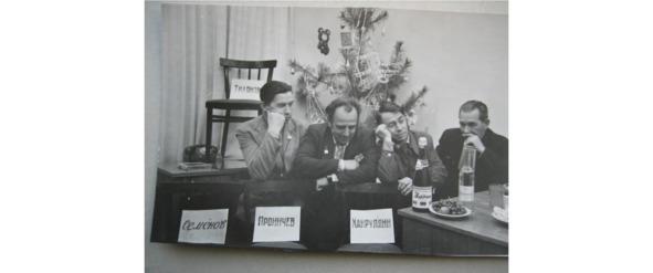 В ожидании Нового года — Антончик, Егоров, Тельнов, Архангельский. Табличками обозначены имена отсутствующих коллег