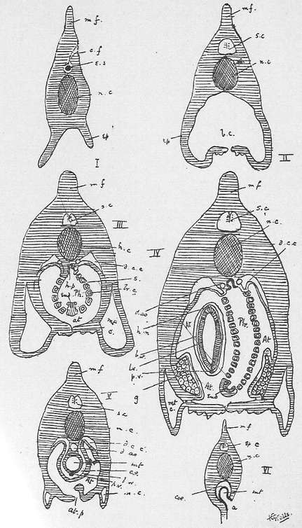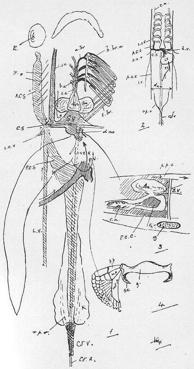 Section 2. At the fore end, or as English zoologists prefer to say, anterior end, of the vertebral column of the rabbit, is of course the skull, containing the anterior portion of the nerve axis, the brain (Figure 1 br.). Between the head and what is called "the body," in the more restricted sense of the word, is the neck. The neck gives freedom of movement to the head, enables the animal to look this way and that, to turn its ears about to determine the direction of a sound, and to perform endless motions in connexion with biting and so forth easily. We may note that in types which swim through the water, the neck dose not appear-- in the fish and frog, for instance-- and the head simply widens out as one passes back to the body. The high resistance offered by water necessitates this tendency to a cigar or ship outline, just as it has determined the cigar shape of the ordinary fish torpedo.