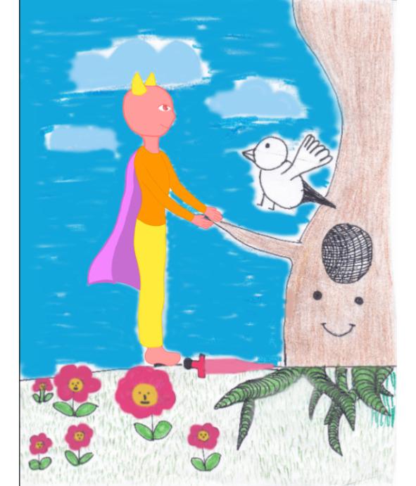 Что летит он в своем красном плаще с мечом в руках по 294 Галактике, и летит не просто так, а на помощь маленькой принцессе из соседнего мира. На нее пытаются напасть дикие звери, а она сидит в лесу на дереве. А голодные звери уже ходят вокруг дерева и думают, что бы такое сделать, чтобы принцесса упала, и напасть на нее. Вдруг ветка, на которой сидела принцесса, подломилась, от страха принцесса вскрикнула. От ее испуга ветка накренилась еще больше, принцесса завизжала, а сук продолжал давать трещину. Тут ветка окончательно сломалась, и она полетела вниз прямо в лапы голодных зверей. В полете она, было, успела подумать, что через пару секунд ей придет конец, но тут в лес с грохотом залетел красный великан. Его громкое появление сразу распугало всех зверей, и те разбежались, а принцессу он поймал в свои ладони. От удара та потеряла сознание, а красный великан закрыл ее своей второй ладонью и понес домой. Принцесса жила в красивом и уютном доме посреди леса. У нее дома было очень тепло и хорошо. Местные жители часто называли ее принцесса леса, потому что она очень любила частенько забираться на дерево и петь красивые песни. Да так звонко, что все обитатели леса сразу слетались на ее голос, чтобы послушать, как принцесса красиво поет. Вот и в этот раз она как обычно вышла, забралась на дерево, чтобы спеть, но злые голодные звери помешали ей. Итак, красный великан отыскал ее дом, конечно не без помощи обитателей леса, но так как он был очень большой и дом был чуть больше его ладоней, он не мог занести принцессу внутрь. Поэтому он попросил синичек сплести покрывало из хвои и листьев и на этом покрывале занести ее внутрь и уложить на ее постель. Синицы почувствовали доброту и заботу красного великана и выполнили его просьбу. Покрывало получилось очень мягким. Принцессу занесли внутрь дома и положили на шикарную постель. А красный великан сел рядом с ее домом и стал ждать ее пробуждения. Когда принцесса проснулась, обитатели леса рассказали ей о случившемся. Она, конечно, поблагодарила своего спасителя, и они решили, что они будут дружить, и помогать друг другу во всем. А еще у них созрел замечательный план попутешествовать по планетам своей 294 галактики, посмотреть, как живут другие существа, получить массу новых впечатлений… и найти новых друзей. Эти чудесные планы прервал громкий стук — тук-тук-тук…