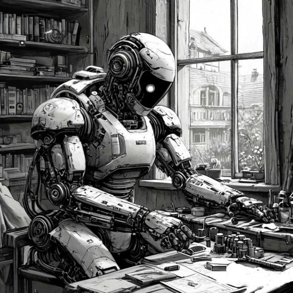 Перед своей смертью хозяин почему-то отключил своего любимого робота от автономного блока питания, стерев часть конфиденциальной информации из его памяти. Поэтому о его смерти робот узнал спустя много лет из личного письма, которое лежало на столе.