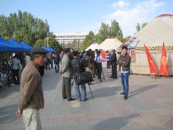 Султан Макашов, интервьюируемый журналистами, на празднике Кыргызской юрты.