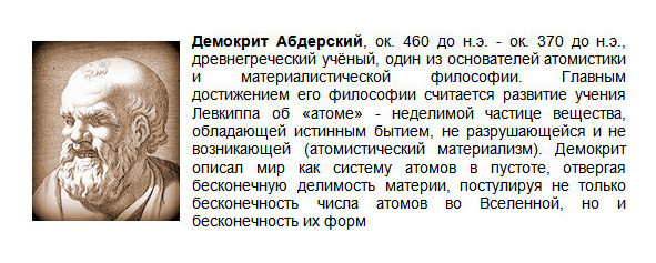 У древнегреческого учёного Демокрита Абдерского, в полном согласии с законом сохранения бытия, возникновение и уничтожение сложных тел происходит путем соединения и разъединения атомов. Из атомов состоят четыре элемента физического мира — земля, вода, воздух и огонь. Самые большие атомы у земли, а самые мелкие — воздуха. Земля, вода и воздух представляют собой смесь атомов всех форм и способны взаимопревращаться. Путём выделения более крупных атомов вода может превратиться в воздух, а земля — воду.