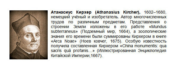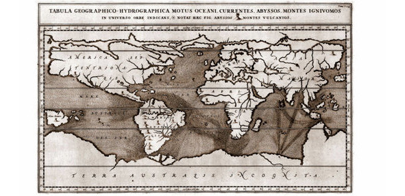 В XVII веке немецкий учёный Атанасиус Кирхер опубликовал книгу, в которой обобщил накопленные сведения о вулканах Земли, гидросфере, морских течениях, ветрах и кругообороте воды в природе. Он пришел к заключению, что морская вода поступает по подземным каналам в пустоты в земных недрах, а откуда после возгонки вытекает, питая родники и реки. Местоположения таких стоков были отмечены на составленной им карте мира водоворотами в Балтийском, Белом, Каспийском, Норвежском, Персидском, Чёрном и других морях сообщающихся с ближайшими бассейнами через подземные протоки.