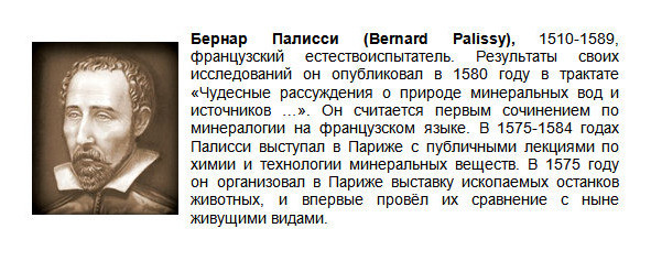 В 1580 году во Франции был издан труд Бернара Палисси «Чудесные рассуждения о природе вод и источников естественных и искусственных, о металлах, солях, камнях, землях, об огне и эмали, со многими другими тайнами предметов, встречающихся в природе. С прибавлением трактата об удобрении земли, всё представленное в виде разговоров, которые ведутся Теоретиком и Практиком». Палисси одним из первых определил дождевые осадки основным источником питания рек и подземных вод. Он также впервые высказал гипотезу о том, что раковины и другие окаменелости это ископаемые останки древних животных.