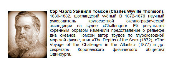 Первые обширные сведения о Мировом океане были получены после кругосветной английской экспедиции на судне «Challenger» (1872—1876). Её результаты коренным образом изменили представления о рельефе морского дна. Инициатор экспедиции и её руководитель шотландский учёный Чарльз Уайвил Томсон использовал для измерений лот своей конструкции с динамометром, а вместо пенькового каната использовал металлическую струну.