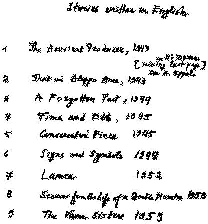 Из списка, помеченного «Рассказы, написанные по‐английски», также воспроизводимого после этого предисловия, Набоков исключил «Первую любовь» (впервые опубликованную под названием «Colette» [ «Колетт»] в журнале «Нью-Йоркер») – то ли по недосмотру, то ли по той причине, что это произведение преобразовалось в главу книги «Свидетельствуй, память» («Speak, Memory», первоначальное название – «Убедительное доказательство»). В верхнем левом углу списка имеются указания по оформлению текста, которые позволяют предположить (несмотря на то что они сделаны по‐русски), что список этот был чистовым вариантом, подготовленным для машинописи. Оба факсимильных списка содержат некоторые неточности. К примеру, рассказ «Сестры Вэйн» был написан в 1951 году[15].