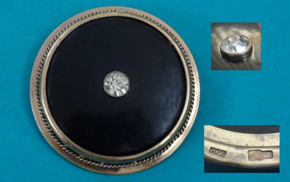 Брошь «Карнавальная ночь». Стиль арт-деко. СССР. Ленинградская ювелирная фабрика. 1956. Диаметр 41 мм. Серебро, бакелит, горный хрусталь. Клеймо: 875 в форме лопатки, изображение профильной головы рабочего с молотком, повернутой вправо. Слева от профиля буква «а». Именник ЛЮ 6.