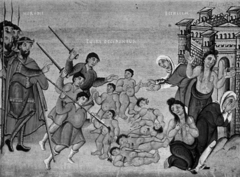 Кодекс Эгберта, лист 15, сцена «Избиение младенцев». Х в. Городская библиотека. Трир, Германия