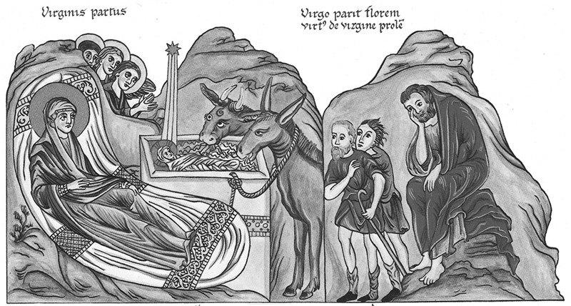Геррада Ландсбергская. Рождество Христово. Иллюстрация из манускрипта «Hortus deliciarum» («Сад наслаждений»), XII в.