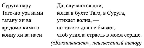 Для более позднего пласта вака периода императорских антологий начиная с Х века характерны более изощренные тропы, которые зачастую наслаиваются друг на друга, образуя некую «ребусную семантику», где в каждом слове или строке закодированы дополнительные образы. В принципе, почти все эти приемы были изобретены еще в эпоху «Манъёсю», но в поэзии VII–IX веков они встречаются редко, скорее в виде исключения. Со временем стремление к сложности и многозначности суггестивного образа становится доминирующим. У ведущих поэтов «Кокинсю» — Ки-но Цураюки, Исэ, Осикоти-но Мицунэ и других — многослойные полисемантические образы присутствуют в большинстве произведений, но первенство в области риторического изыска, вероятно, принадлежит блистательной Оно-но Комати, служившей идеалом и образцом для подражания многим поколениям стихотворцев. Каждое ее пятистишие — подлинный tour de force. На примере одного из шедевров Комати мы можем увидеть в действии, пожалуй, самый эффектный поэтический прием классической поэтики вака — какэкотоба («слово-стержень»), который охотно использовали многие поэты вплоть до XX века: