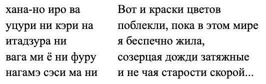 Какэкотоба — слово-стержень с двойным значением, создающее эффект омонимической метафоры. В приведенном пятистишии целых три какэкотоба, и каждое из них несет в себе дополнительные аллюзии. Так, иро означает «краски», «цвет», а в другом значении — «любовь», «чувство». Фуру означает «идти», «лить» — о дожде, а в другом значении — «стареть». Нагамэ означает «затяжные дожди», а в другом значении — «созерцать». Разумеется, передать в поэтическом переводе буквально все значения невозможно, да и в оригинале они выражены довольно смутно. Однако внимательный средневековый читатель, искушенный во всех тонкостях поэтического искусства, должен был уже при первом прочтении уловить весь аллюзивный подтекст.