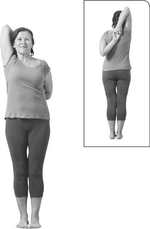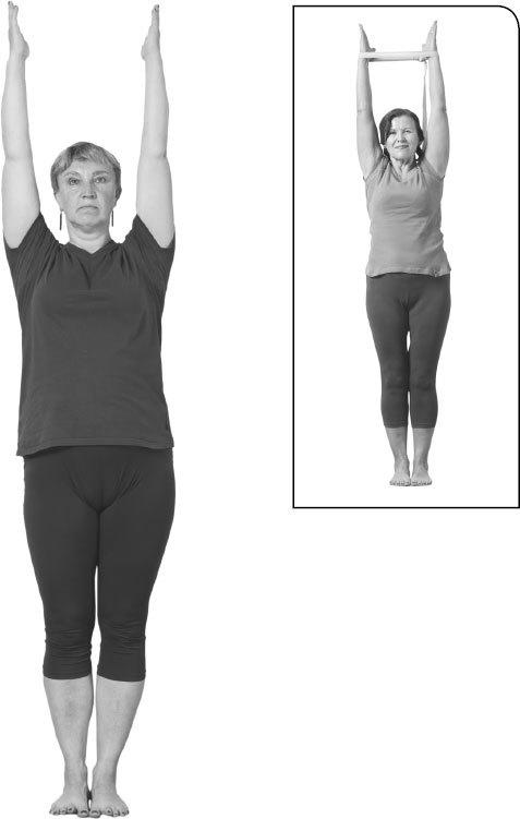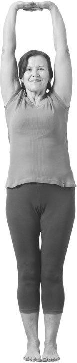 Встаньте в Тадасану. Вытяните руки перед собой. Переплетите пальцы рук в замок. Выверните ладони наружу. Со вдохом вытяните руки вверх так, чтобы они оказались в одной плоскости с головой, туловищем и ногами. Держите руки вытянутыми в локтях. Не поднимайте плечи. Не напрягайте шею и голову. Смотрите прямо перед собой. Дышите спокойно. Останьтесь в позе 20–30 секунд. На выдохе опустите руки вниз. Расплетите пальцы рук. Вытяните руки вдоль туловища. Сделайте одно-два дыхания. Снова вытяните руки перед собой и поменяйте переплетение пальцев рук (если сверху был правый указательный палец, пусть теперь сверху окажется левый). Поднимите руки вверх и останьтесь в позе еще 20–30 секунд. На выдохе опустите руки и вытяните их вдоль тела.