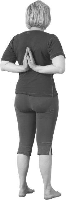 Встаньте в Тадасану. Отведите руки немного назад и соедините ладони за спиной. Разверните пальцы рук и ладони к потолку. Полностью соедините ладони и поднимите их до грудного отдела позвоночника. Прижмите ребра ладоней со стороны мизинцев к позвоночнику. Отведите плечи и локти назад, раскрывая грудную клетку. Втяните лопатки и опускайте их вниз по спине. Дышите спокойно. Останьтесь в позе 20–30 секунд. На выдохе освободите руки и аккуратно вытяните их в Тадасане.