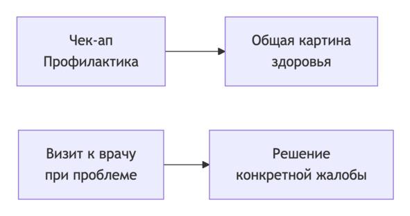 Чек-ап — это плановое обследование, которое помогает понять, всё ли в порядке с организмом и нет ли скрытых изменений, которые невозможно заметить самостоятельно. В отличие от обычных жалоб или ситуаций, когда нужно обратиться к врачу из-за конкретной проблемы, чек-ап проводится тогда, когда тебя ничего не беспокоит. Его цель — получить общую картину состояния здоровья, чтобы ты знала, на что стоит обратить внимание в дальнейшем.