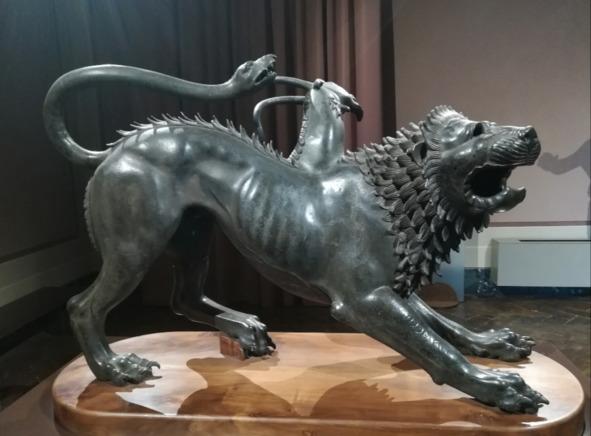 Из бронзы этрусские скульпторы отливали статуи и статуэтки для украшения храмов, жрецы использовали некоторые из них для ритуальных обрядов. Самые известными являются: Химера из Ареццо, Миневра и Оратор. Сейчас эти статуи находятся в археологическом музее Флоренции, а когда-то они были частью коллекции династии Медичи. Химера — мифологическое существо с туловищем и головой льва, посередине его хребта находится коза, а его хвост — это змея. Существо совершенно нереальное, поэтому слово «химера» стало нарицательным и олицетворяет что-то невозможное. Химера, по мифологии, является порождением свирепого, огнедышащего великана Тифона и женщины–змеи по имени: Ехидна. От них же родились: Немейский лев, трехглавый пёс Цербер, Колхидский дракон, Лернейская гидра и другие мифологическое чудовища.