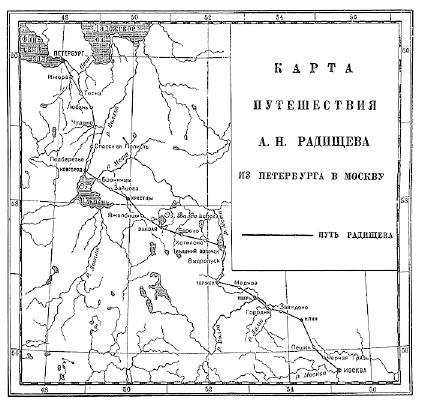 [15] Карта путешествия Радищева из Петербурга в Москву. Из книги: Радищев А. Н. Путешествие из Петербурга в Москву. Фотолитографическое воспроизведение «Путешествия» (репринт) издания 1790 г. Материалы к изучению «Путешествия». В 2 т. Т. 1–2. — М.; Л.: Academia, 1935.