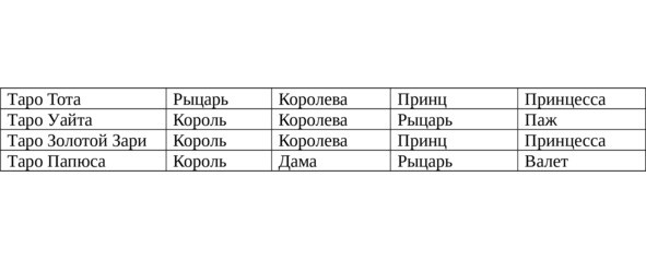 Обратите внимание: то, что в Таро Уайта – Король, то в Таро Тота – Рыцарь. То, что у Таро Уайта Рыцарь, то в Таро Тота и Золотой Зари – Принц. Помимо этого можно встретить самые разнообразные варианты названий – Воин, Слуга, Сын, Праматерь, Всадник, Вестник, Муза, и даже Тренер, а иногда Фигурные карты связывают не с фигурами людей, а со странами, народами и историческими периодами, но все эти экзотические варианты не имеют важного значения. Чтобы не запутаться в названиях учитывайте следующие соотношения, приведенные в таблице.