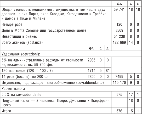 Таблица 1 отражает доход, полученный Козимо ди Джованни де Медичи перед седьмым катасто 1457 г. В то время в семью Козимо входили его супруга (Мадонна Контессина), два его сына (Пьеро и Джованни), племянник (Пьерфранческо) и их жены и дети, всего 14 человек. Козимо утверждал, что, если учесть слуг, служанок, нянь и гувернеров, ему приходилось ежедневно кормить 50 ртов. Однако ему позволяли сделать вычеты только для ближайших родственников. Как показывает таблица, его имущество, облагаемое налогом, оценивалось в 115 170 флоринов, и налог он платил по единой ставке 0,5 %. Вдобавок он платил подушный налог в 6 сольдо за трех мужчин (Пьеро и Джованни ди Козимо, а также Пьерфранческо ди Лоренцо) в возрасте от 18 до 60 лет. Поскольку сам он к тому времени разменял восьмой десяток, его от выплаты подушного налога освободили. Козимо подавал общую налоговую декларацию, потому что семейное имущество оставалось частично не разделенным между ним и его племянником, единственным выжившим сыном его брата Лоренцо[17].