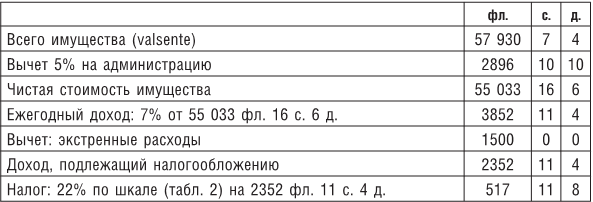 Например, Антонио ди Таддео ди Филиппо, партнер Медичи, задекларировал valsente в размере 3288 фл. 7 с. 4 д., и после вычета 5 % сумма составила 3066 фл. 19 с. Эта цифра при 7 % дает ежегодный доход в 214 фл. 13 с. 9 д. В соответствии со шкалой (табл. 2) налог Антонио составлял 18 % от этой суммы, или 38 фл. 12 с. 9 д., что соответствует portata. Поскольку у меня получились те же результаты, видимо, мой метод расчета налога правилен.