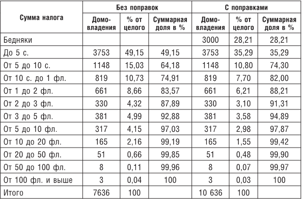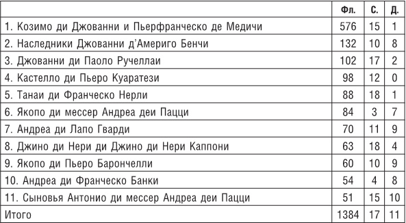 В соответствии со сводкой 1457 г., всего 227 домохозяйств платили более 10 флоринов налога (таблица 4). В 1427 г. насчитывалось 200 домохозяйств, плативших 25 флоринов или более. Такое расхождение легко объясняется тем, что в 1427 г. оценка в целом была выше, чем в 1457 г., возможно, из-за смены методов. Во всяком случае, в 1457 г. насчитывалось всего 3 домохозяйства, которые платили налог более 100 флоринов (таблицы 4 и 5). Медичи значительно опережали остальных. За ними шли наследники Джованни д’Америго Бенчи, бывшего главного управляющего Банком Медичи, а на третьем месте находился Джованни ди Паоло Ручеллаи, банкир, который нанял Лео Баттиста дельи Альберти (1404–1472) для постройки знаменитого дворца и лоджии на виа Делла Винья Нуова и фасада базилики Санта-Мария Новелла.
