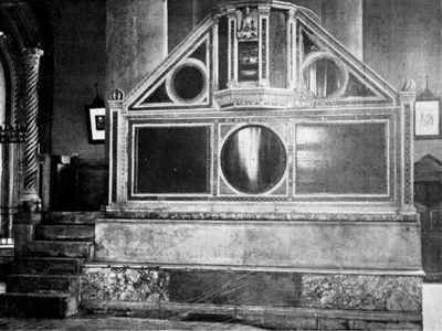The marble pavements, made up of discs, squares, and other geometrical forms of colored marbles surrounded by bands or borders of a smaller scale, were similar in design to some of the mosaics shown in our plates. This work is known as Opus Alexandrinum and is familiar from the pavements of St. Mark's and the church of Santa Maria dei Miracoli in Venice.