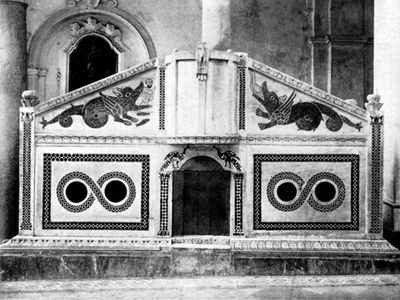 The two pulpits and that in the choir in front of the archbishop's throne, which are said to have been executed by order of John of Procida, are fine examples of the rich mosaic work of the period. The two large pulpits are placed in the nave, before the choir, which here has retained its original position in front of the high altar. Stairs opening out of the choir, finely decorated in mosaic, lead to each pulpit. In front of the larger one on the right is a fine Paschal candelabrum, decorated in mosaic. The pulpit itself is supported on twelve granite columns, while the four supports of the opposite ambo are the very rare black porphyry called Porfido Nero-Bianco. The raised space between is paved in Opus Alexandrinum.