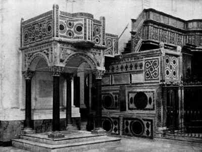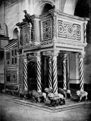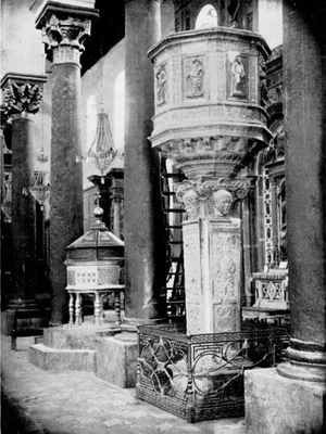 The marble pulpit, or Gospel ambo, inlaid with mosaics, was built, according to a Latin inscription which it bears, in the year 1272, at the cost of Niccolo Rufolo, a descendant of the grand admiral. Another inscription records the fact that it was the work of Nicholas, the son of Bartolommeus of Foggia.
