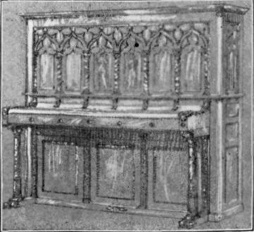 The three remaining designs published were considered worthy of mention, each in its own way. The Gothic design could be made very rich and interesting with panel colored decoration. The upper portion is well proportioned, the lower portion somewhat too meagre. The Colonial design is interesting above the keyboard; the arches below the "trusses" are out of scale. The Baroque design would depend for its good or bad quality entirely upon the delicacy and skill with which the carving was done. Both the Gothic and Baroque designs could only be used in rooms of their own respective styles.