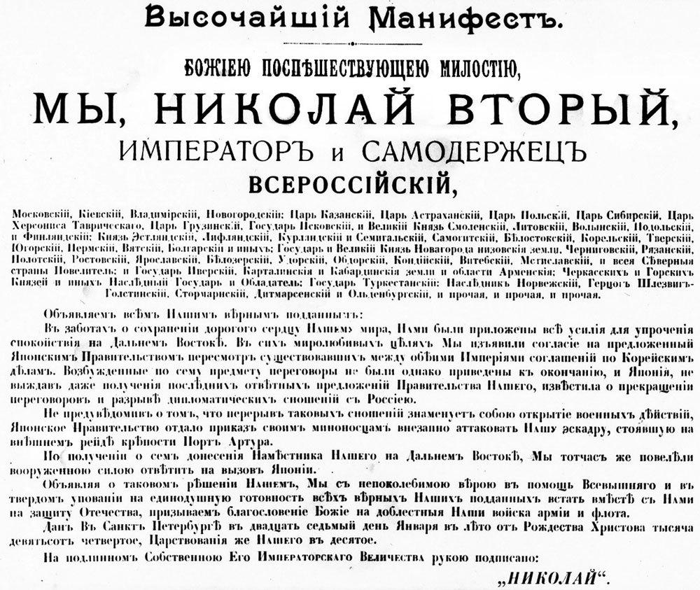 28 января все газеты опубликовали царский манифест, где всем подданным объявлялось: «В заботах о сохранении дорогого сердцу Нашему мира, Нами были приложены все усилия для упрочнения спокойствия на Дальнем Востоке. В сих миролюбивых делах Мы изъявили согласие на предложенный японским правительством пересмотр существовавших между обеими империями соглашений по корейским делам. Возбужденные по сему предмету переговоры не были, однако, приведены к окончанию, и Япония, не выждав даже получения последних ответных предложений Правительства Нашего, известила о прекращении переговоров и разрыве дипломатических сношений с Россиею. Не предуведомив о том, что перерыв таковых сношений знаменует собой открытие военных действий, японское правительство отдало приказ своим миноносцам внезапно атаковать Нашу эскадру, стоявшую на внешнем рейде крепости Порт-Артур.